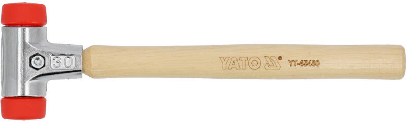 YATO YT-45480 műanyag kalapács hikkori nyéllel és két fém burkolatban rögzített ütőfejjel. Az UPE anyag használata nagyon nagy tartósságot, kopásállóságot és sok vegyszerállóságot biztosít.